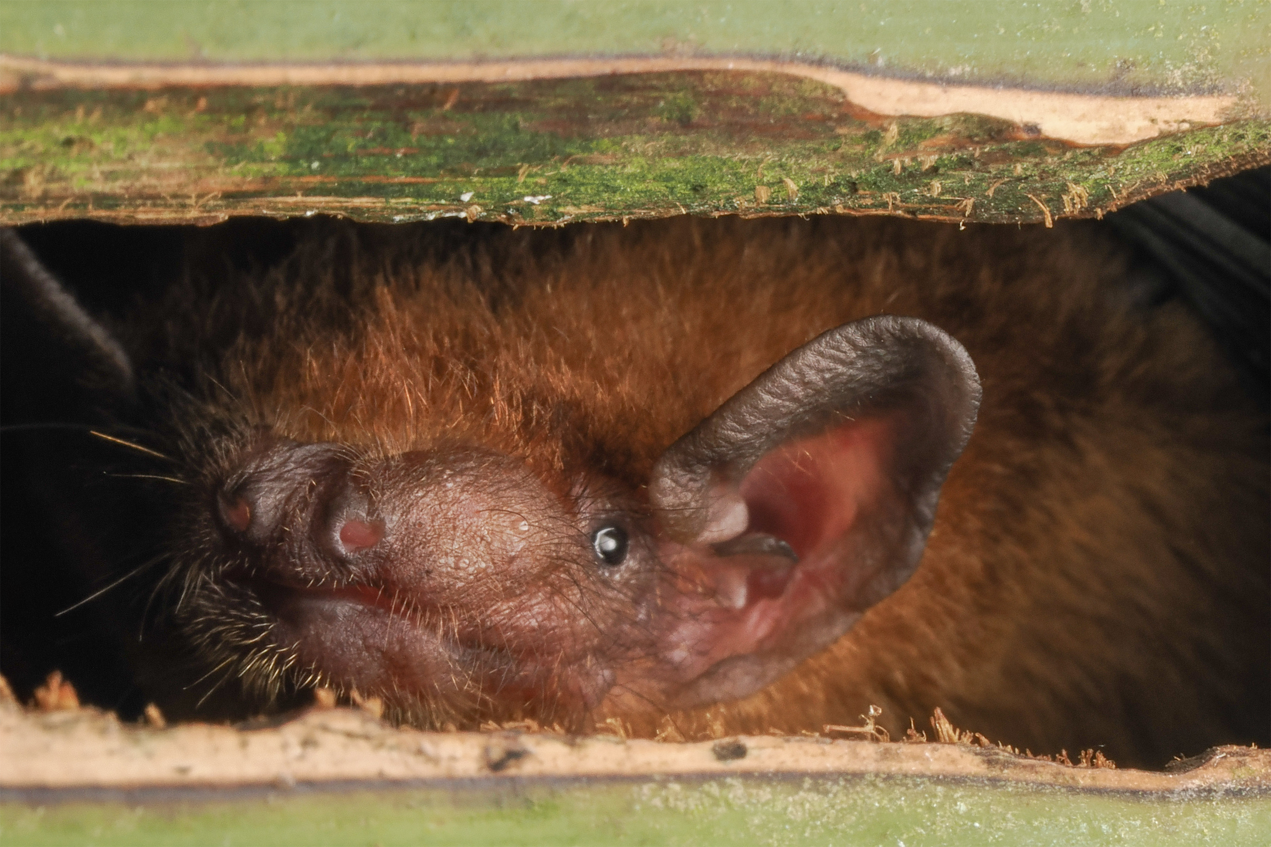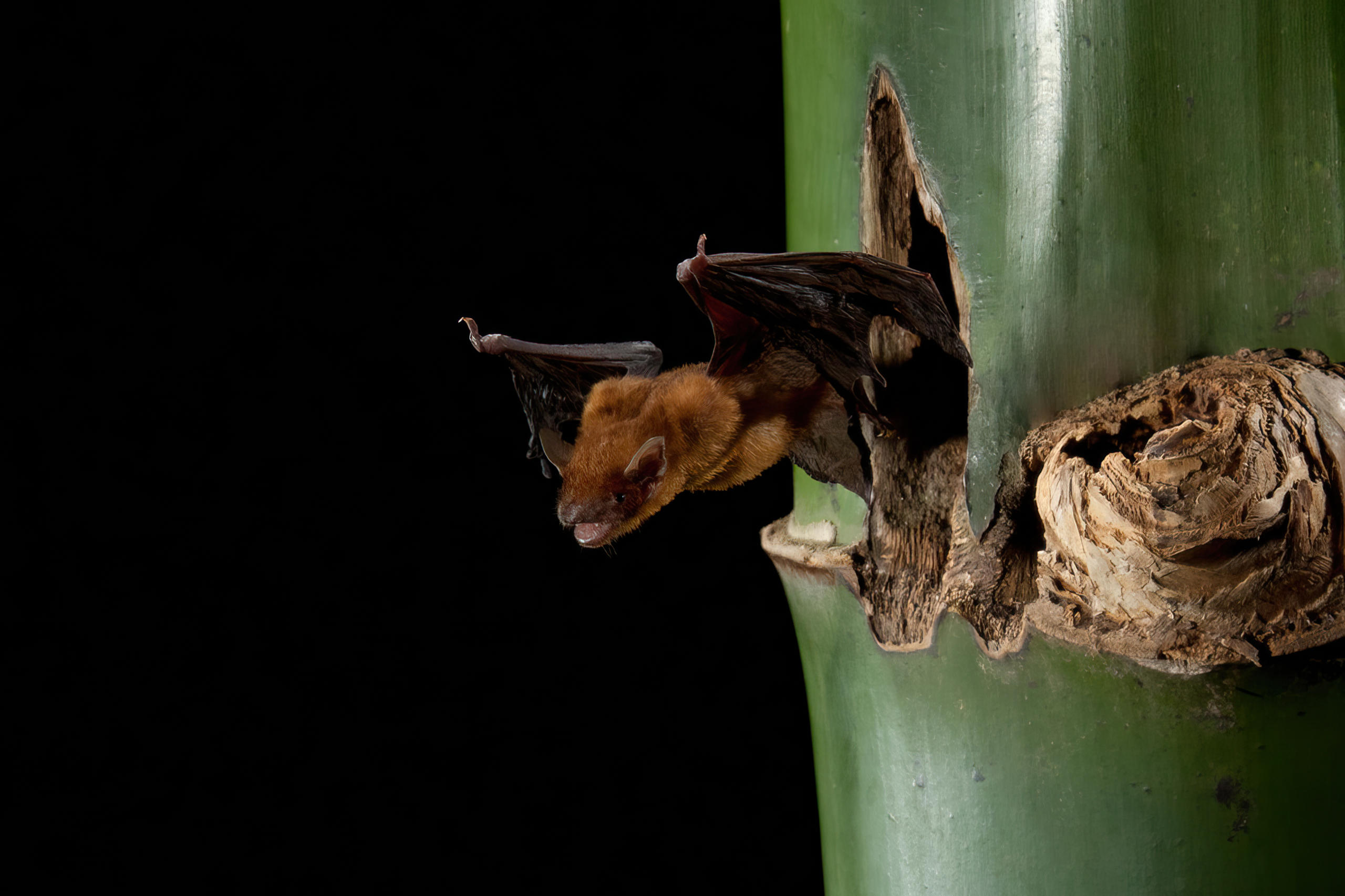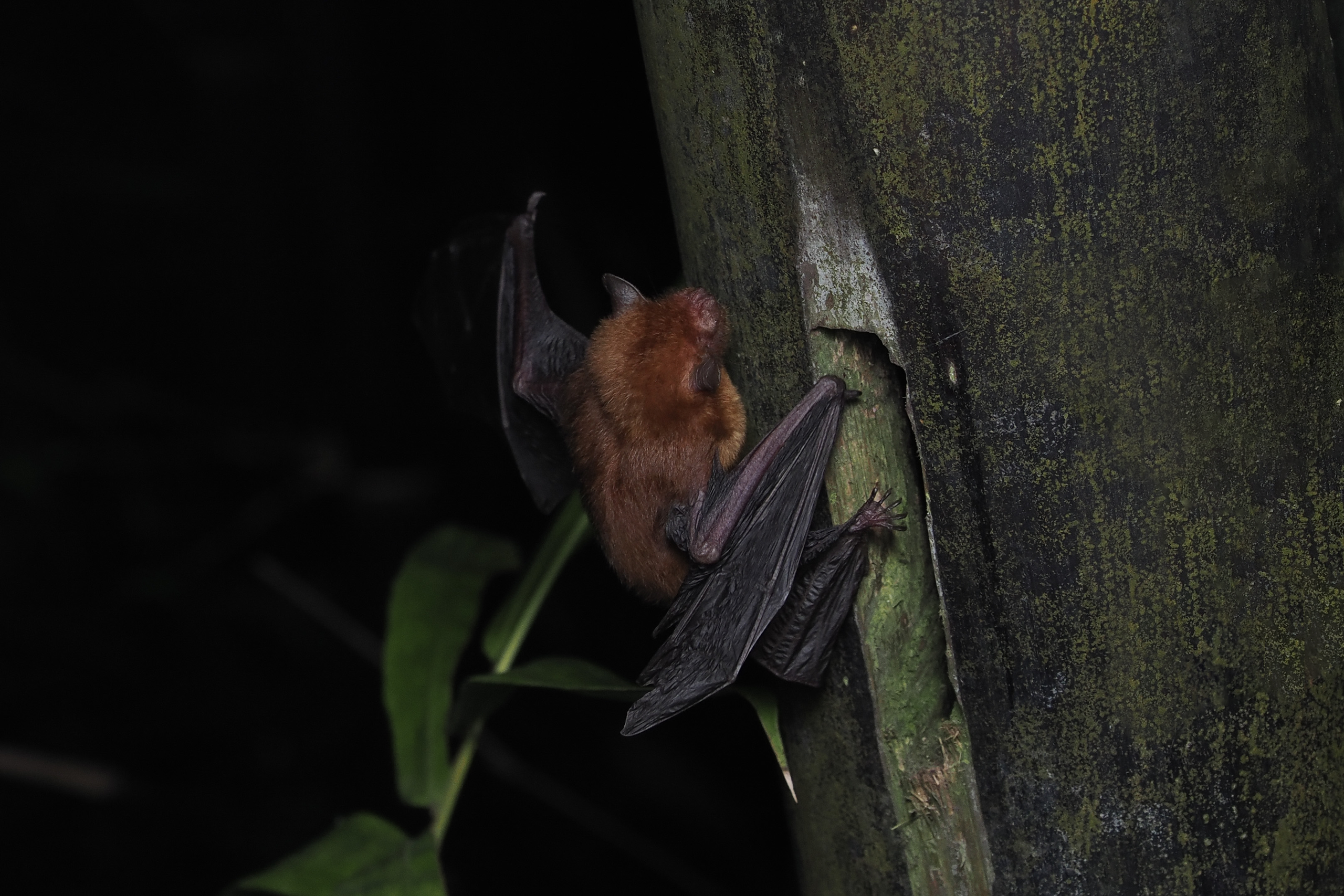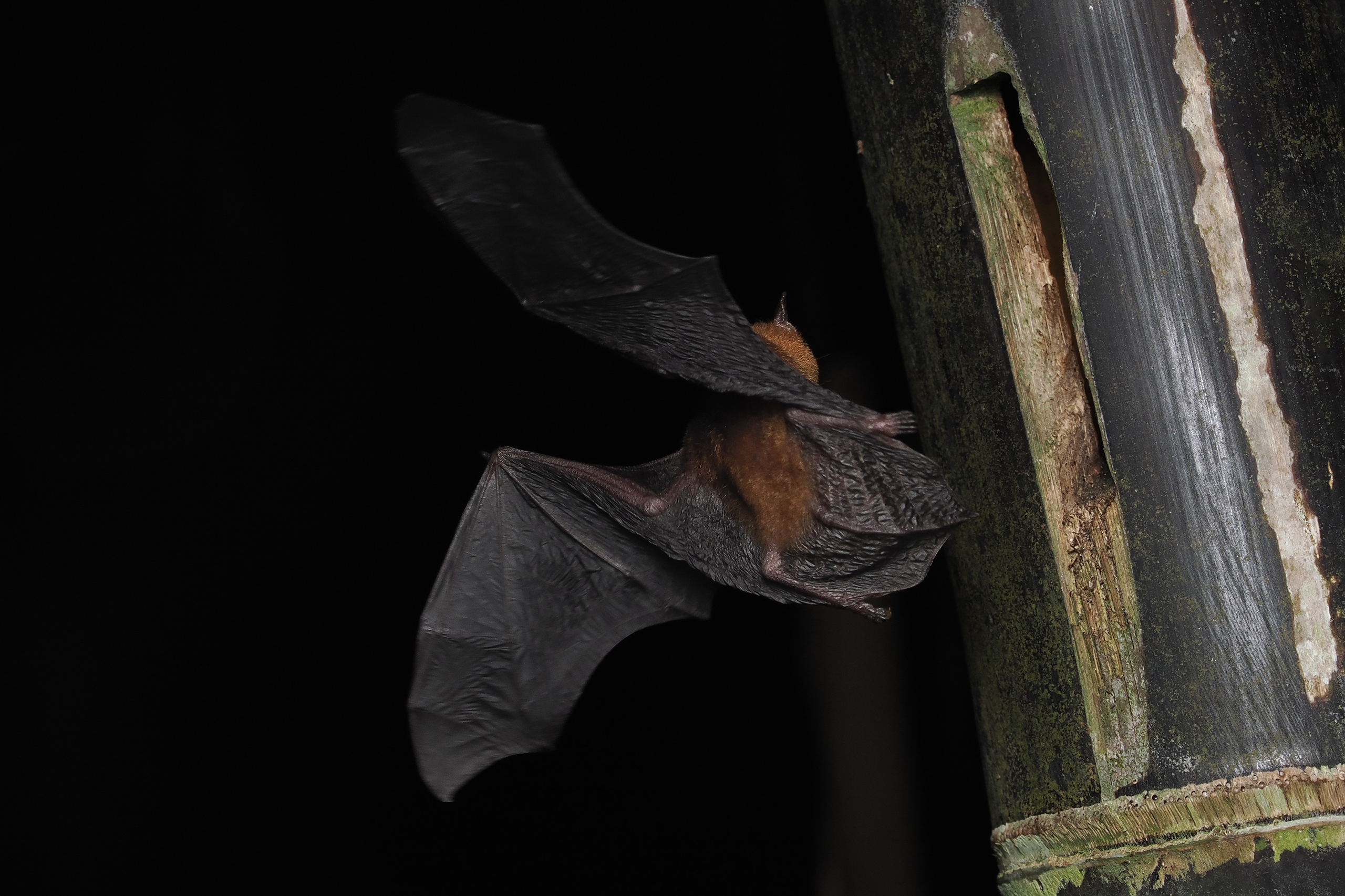 | 覓食: | 屬晨昏活動型蝙蝠,在傍晚及黎明前後有兩次外出活動高峰,中途要回巢休息,每次活動時間十分短暫,約60分鐘。一般於日落前後約5-10分鐘及日出前約45分鐘飛出,飛離竹筒後習慣於竹叢上空盤旋或在竹叢之間穿梭,其後直接飛到覓食地點(有時覓食地點離棲地甚遠),以中慢速在樹冠層或水體上方盤旋覓食。大多數個體約在45分鐘後開始回巢,且所有個體通常會在離巢後60分鐘內回巢。 |